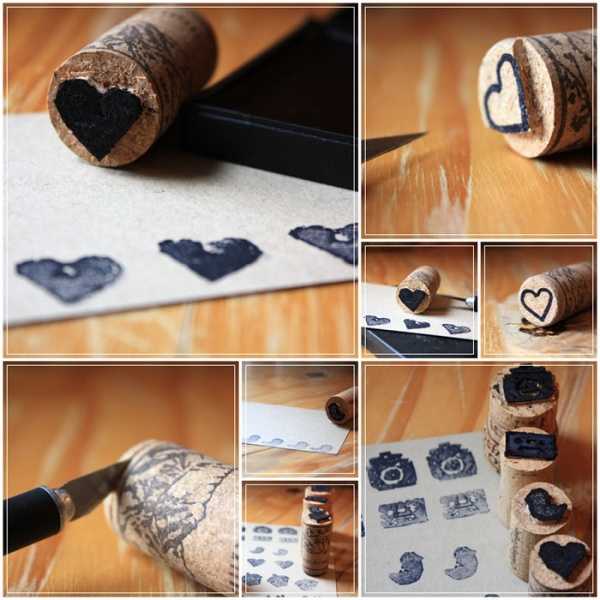 При помощи винных пробок, острого перочинного ножа и маркера можно сделать «фирменные» печати. Для этого нужно сначала нарисовать нужную фигурку а затем вырезать ее на пробке. Такие отпечатки можно использовать на открытках, в письмах или просто для игр с детьми.