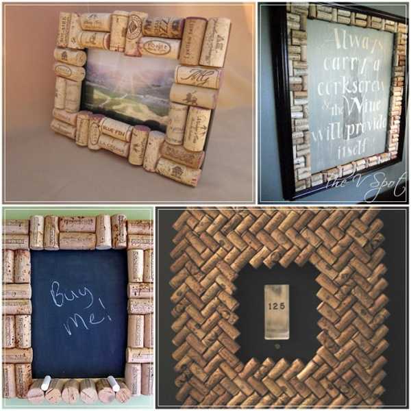 Вот такие оригинальные рамки для картин и фотографий получаются из винных пробок. При этом можно смело экспериментировать: клеить пробки вдоль, поперек или «елочкой», использовать их целиком или разрезать на части. Все зависит от интерьера, где будут висеть эти необычные рамки. Кстати, не стоит ограничиваться только фотографиями и картинами – пробками можно окаймить и зеркало, и доску для письма мелом и многое другое.
