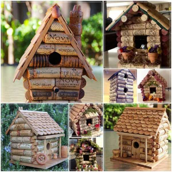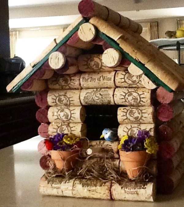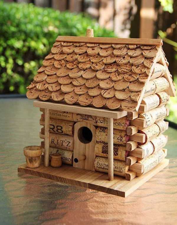 Из плотного картона вырезаем дно, стены и крышу домика. Обклеиваем целыми или разрезанными вдоль винными пробками стены, а крышу покрываем «черепицей» из кружочков разрезанных поперек пробок. Получилось очень красивое жилище для птиц – настоящий сказочный теремок. Не забываем в процессе работы о круглом входном отверстии и небольшой палочке, на которую птички встают, прежде чем попасть в домик. Изготавливая такой красивый скворечник, родители могут много интересного поведать о птицах и их повадках детям, а заодно научить подрастающее поколение заботиться о живой природе.
