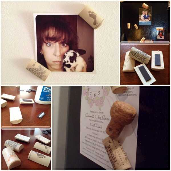 Распилив пробку пополам и приклеив к ней магнитную полоску, у вас получится оригинальный магнитик на холодильник. С помощью него можно прикреплять фотографии, записки, списки покупок и другие важные мелочи.