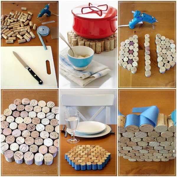 С помощью клеевого пистолета, наждачной бумаги, атласной ленты, ножа и нескольких десятков винных пробок несложно будет самим создать подставку под горячее, ведь всегда приятнее использовать то, что сделано своими руками, чем купленную аналогичную вещь. Разрезаем пробки пополам, придаем им цилиндрическую форму, зачищаем бока и склеиваем между собой в виде круга, шестигранника или восьмигранника. Внешний край подставки обклеиваем атласной или другой декоративной лентой, тесьмой. Если сбоку сделать из той же отделочной ленты петельку, подставка под горячее станет еще функциональнее. Можно использовать пробки, не разрезая их пополам, тогда подставка под горячее станет просто в два раза выше.