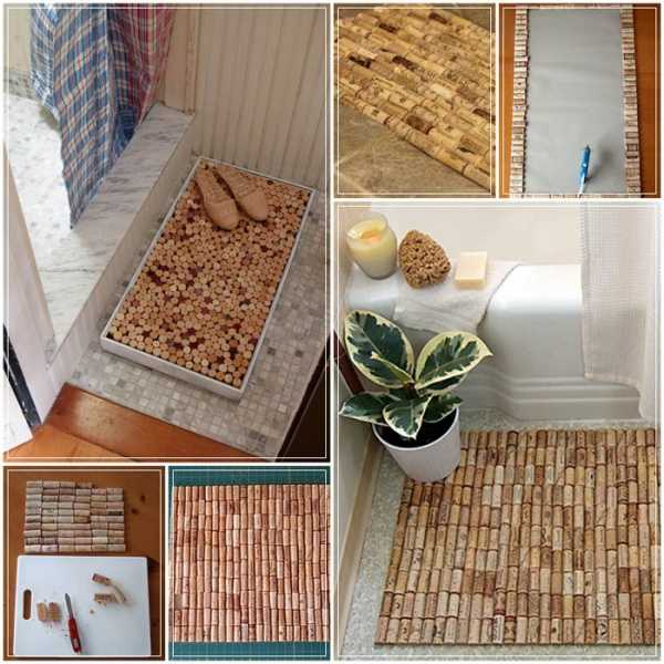 Древесина, из которой изготовлены винные пробки, является долговечным материалом, поэтому и коврик из них прослужит вам достаточно долго. Сделать его можно из целых пробок, склеенных между собой и помещенных в металлический поддон, а можно из половинок разрезанных вдоль пробок, приклеенных на прорезиненную основу. Первый вариант более приемлем для прихожей, а второй – для ванной комнаты.