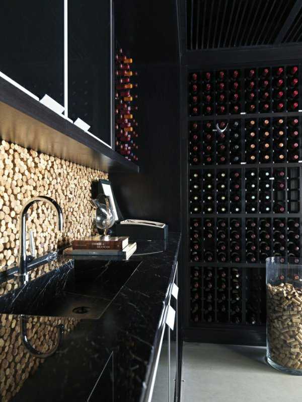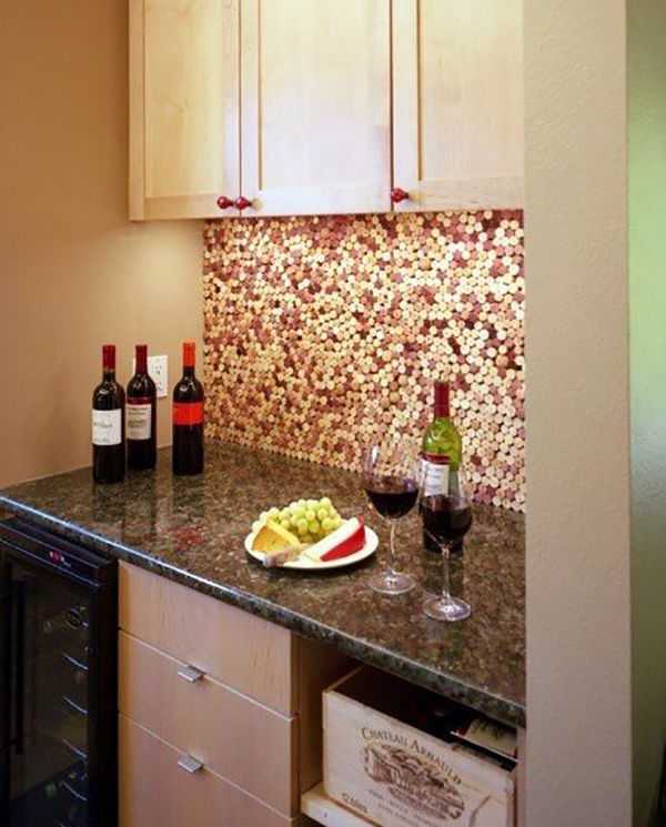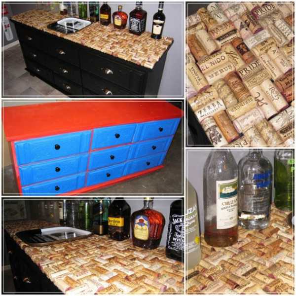 Такую эффектную и оригинальную столешницу легко сделать самостоятельно, приклеив винные пробки к существующей столешнице жидкими гвоздями и покрыв подходящим по цвету лаком. Сложно будет сохранить первозданный вид такой столешницы в течение длительного времени, но выглядит она шикарно!