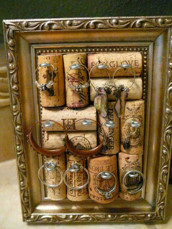Модницы с большим арсеналом украшений не понаслышке знают, как тяжело хранить их в порядке, позволяющем быстро найти нужную вещь. В шкатулочках бусы путаются, а выбор подходящих серег — тоже непростой процесс. Особенно актуальным хранение на виду всех украшений становится при спешке. Упростить себе задачу хранения и выбора нужных украшений можно с помощью рамки, на дно которой приклеены пробки целиком, половинками, кружочками или в сочетании. Сделав несколько крючков, вы упорядочите хранение бус и браслетов, а сережки можно втыкать непосредственно в древесину или между пробками.