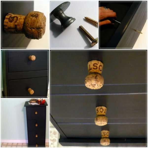 Если сломалась ручка у шкафа или комода, не спешите обивать пороги мебельных магазинов в поисках замены. Можно пойти другим путем и сделать необычные ручки из винных пробок. Для этого их нужно немного подточить, а потом прикрепить при помощи шурупов к дверце или ящику. Для кого-то это станет временной мерой, а для кого-то – оригинальной деталью в интерьере.