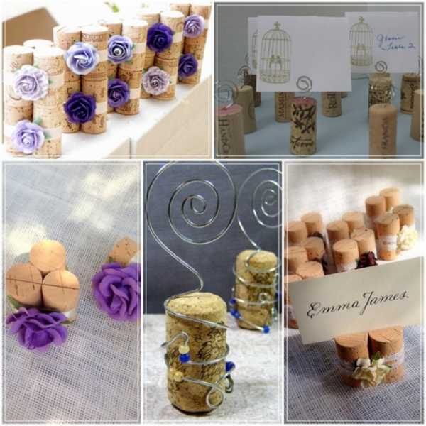 Держатели для визиток, карточек, записок, имен приглашенных на торжество можно выполнить двумя способами. В первом случае в пробку ввинчивают закрученную с одного конца по кругу проволоку или, украсив бусинами, красиво обвивают проволокой. Во втором случае на скрепленных между собою изящной тесемкой или резинкой пробках делают горизонтальный надрез, в который вставляют нужный листочек бумаги.
