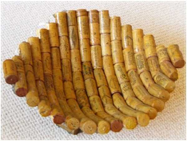 Склеивая боковые поверхности пробок друг с другом, можно создать такую интересную вазу для хранения овощей, фруктов и хлеба. Чтобы у нее получилась та же форма, что и на фото, работу следует начинать со дна, постепенно формируя края вазы. В заключение покрываем ее нетоксичным лаком. Для большей безопасности пищевые продукты кладем на ажурную салфетку.