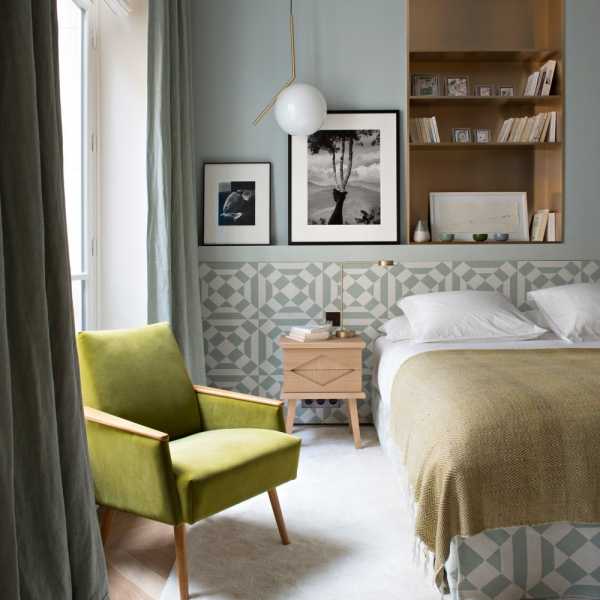 Кровать изголовьем к длинной стене в современной небольшой спальне с удобной встроенной нишей