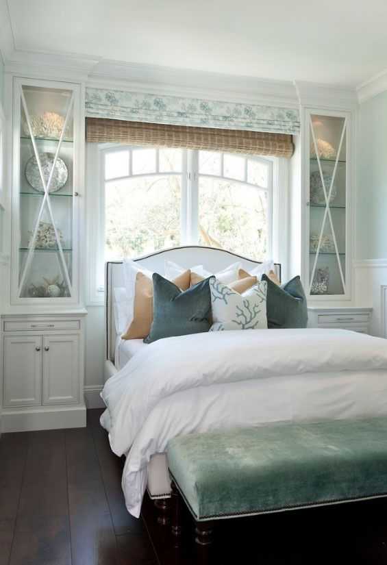 Установить кровать изголовьем к окну в небольшой спальне — эффективный способ экономии пространства. Так площадь помещения будет использована наиболее рационально, а у свободной стены можно поставить небольшой шкаф или зеркало со столиком и останется немного места, чтобы свободно передвигаться по комнате.
