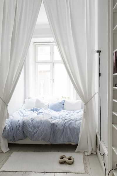 Некоторые считают, что кровать возле окна мешает поливать цветы, мыть стекла, вытирать пыль на подоконнике или раздвигать шторы. Решить эту проблему можно, разместив кровать на расстоянии 15-20 см от окна.