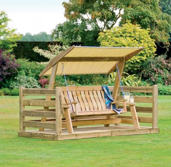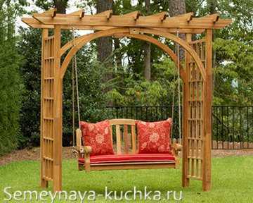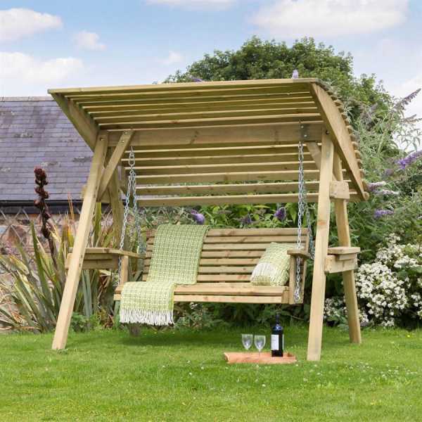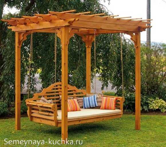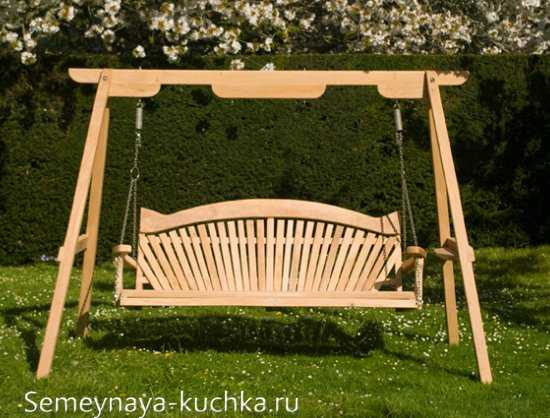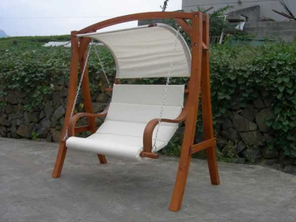 Классическим же вариантом являются садовые качели, изготовленные из дерева. Дерево прекрасно вписывается в обстановку любого садового участка. В зависимости от сложности конструкции и дороговизны породы, качели могут быть как самыми простыми, так и премиум-класса.