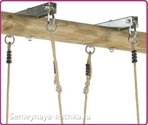 Перед закреплением к скамье, отрезки цепи продеваются в кольца. Затем, вся конструкция крепится к перекладине оцинкованными винтами.