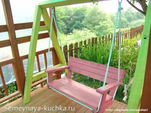Впрочем, зачем лишать себя удовольствия дома. Если у вас большая веранда с крепким перекрытием, можно сделать качели и там, например, в виде подвешенного дивана. Наверно приятно подремать на свежем воздухе на мягких подушках