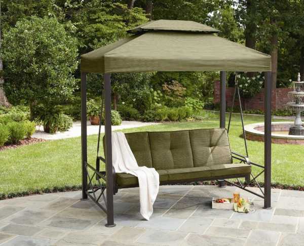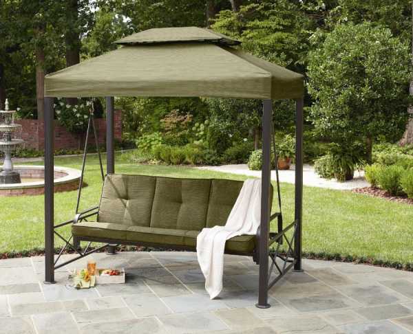 Использовать качели диван можно и в такой беседке парголе. Сегодня они очень модные, хотя и не очень практичные. Если пойдет дождик, подушки придется спасать, но зато это так по европейски. На таком диванчике можно представить, что находишься на берегу Эгейского моря.