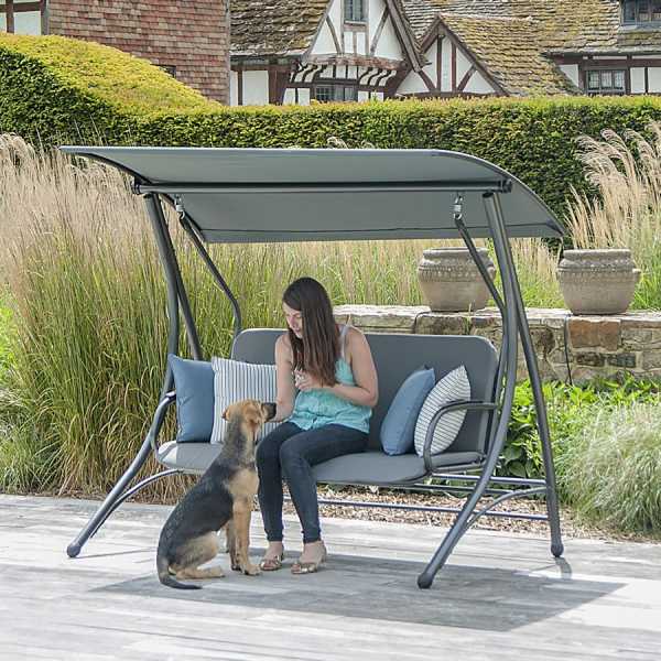 Раскачивающийся лежак на цепях, с популярным стационарным навесом пергольного типа