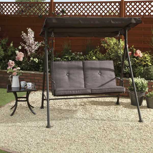 Комплект качелей и садовый столик, подходящих друг другу по исполнению