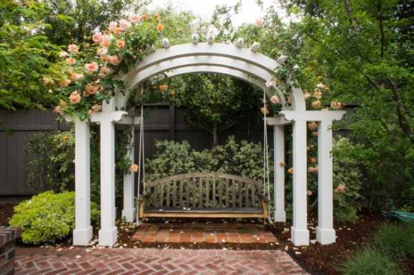 Садовые качели в тихом уголке, обвитые ароматной розой: здесь можно расслабиться и подумать о чем-то приятном