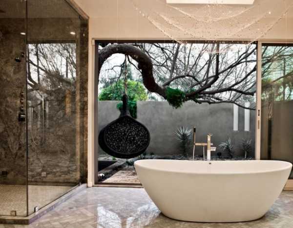 Черная круглая качель, подвешенная на дереве, идеально вписывается в интерьер сада и дополняет невероятный вид из панорамного окна ванной, хоть участок и глухо закрытый