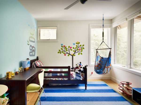 На фото вариант установки качелей в квартире, подвесное кресло размещено в детской для мальчика.