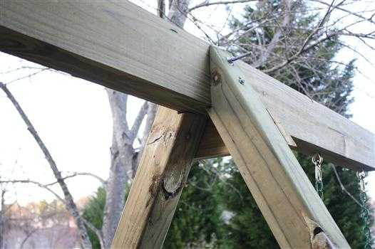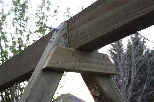 В углубления устанавливаются брусья и соединяются под углом на середине участка. Между парами брусьев устанавливается перекладина. Для закрепления прочности конструкции, в углах соединения перекладины с опорами устанавливаются уголки, а на расстоянии 25 см от верха и 30 см от низа А-образной рамы осуществляется стяжка досками.