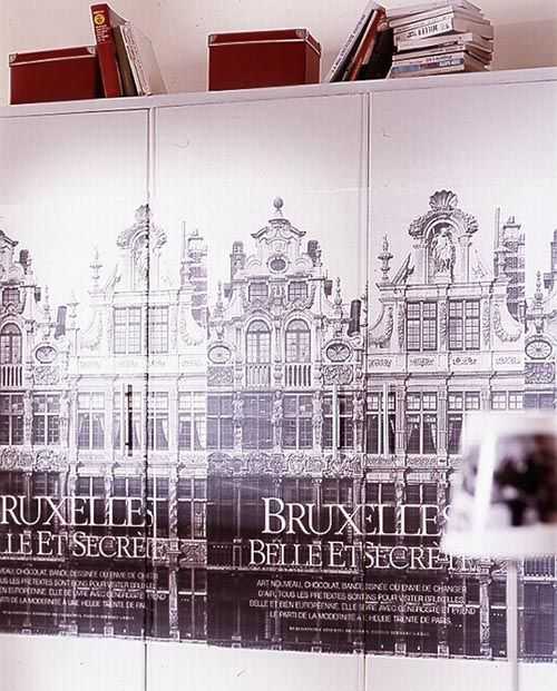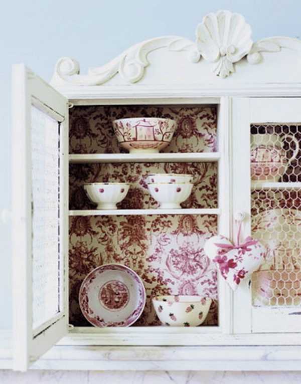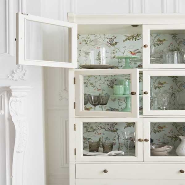 Дверцы — самый важный элемент, который всегда на виду. Их можно декорировать как одинаковыми по стилю обоями, так и разными, получится аналог пэчворка-квилтинга.