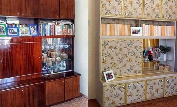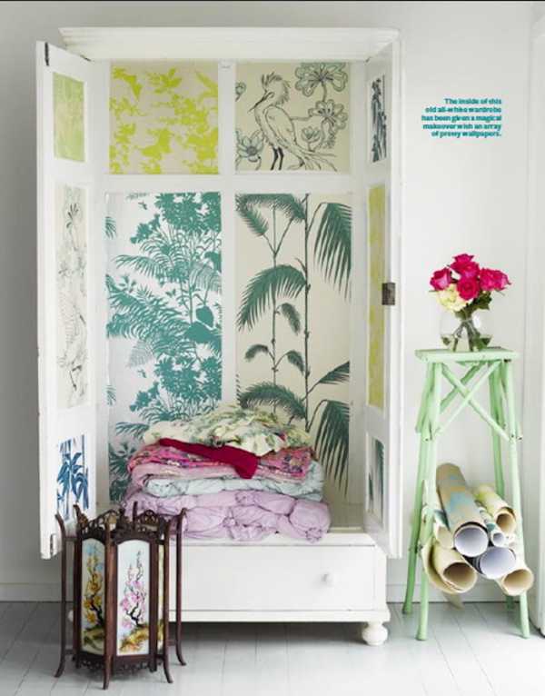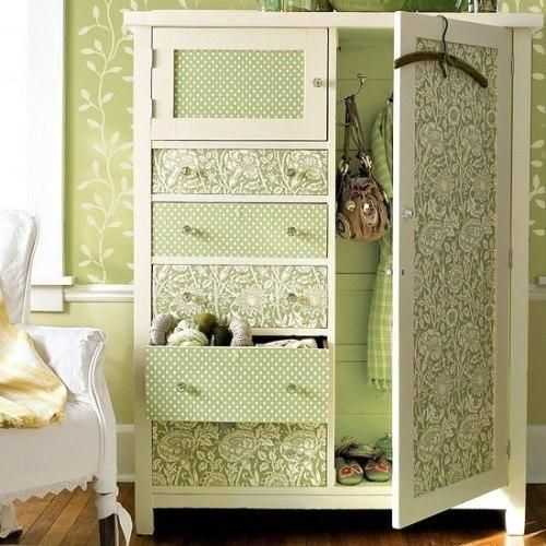 У каждой хозяйки имеются оставшиеся рулоны обоев после отделки помещений. Не стоит торопиться избавляться от них, ведь они могут стать отличным помощником в оформлении шифоньера. Главный их плюс – это отличное скрытие недостатков поверхности, ведь бумага легко накладывается на любые изгибы. Стоит отметить, что отделка обоями своими руками отлично гармонирует с деревянной поверхностью. Такое сочетание современно и практично. Для того чтобы поверхность обоев прослужила долгий срок, специалисты советуют покрывать ее лаком.