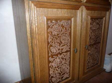 Такой способ декорирования подразумевает создание уникальной поверхности на фронтальных частях шкафа, полностью имитирующий резьбу по дереву. Даже специалист с близкого расстояния вряд ли отличит декор от настоящей резьбы, что уж говорить о ваших гостях, которые будут просто поражены преображением давно знакомой мебели.