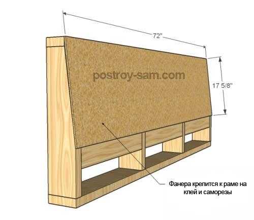 Спинка обычно делается полой внутри. Форму ей можно придать прямоугольную либо покатую. Для этого торцевая ширина у основания увеличивается, а вверху уменьшается. Боковые части делаются точно так же, как и спинка. Верх и лицевая сторона спинки оклеиваются поролоновыми матами. На внутренние стороны боковых частей поролон наклеивается тоже. Клей нужно наносить широкой кистью равномерным слоем. До полного схватывания клея поролоновые листы должны быть плотно прижаты к оклеиваемой поверхности.