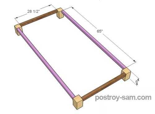Ножки изготавливаются из бруса или покупаются в магазине уже готовые – пластиковые, железные или из другого материала. Необходимо сбить прямоугольник с крышкой из досок или ДСП, а затем прикрутить ножки, как указано на схеме. Сзади приделать брус или доску, обшитые ДВП, или лист ДСП.