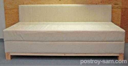Если вы хотите сделать более функциональную модель, стоит применять другую схему. Из досок или ДСП собирается П-образный фрагмент. Внутри крепятся половинки подвижных механизмов, части которых прикрепляются к собранному отдельно ящику, что позволяет ему легко и правильно функционировать. Место для сиденья устанавливается сверху основы. К ней же крепится задняя часть конструкции. Обтяните все это поролоном и тканью, как в первом случае, или уложите матрас и подушки для создания мягкой части.