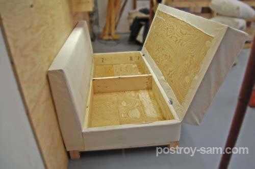 Этот механизм является распространенным и очень удобным вариантом на сегодняшний день. Начинать его создание, как и в предыдущем случае, стоит с ящика для белья. Спинка и сиденье делаются из бруса и реек, собранных в решетку с прикрепленным листом ДВП, а вот обтягиваются эти детали по отдельности.