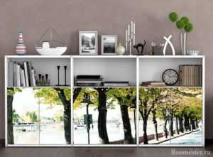 - Шкаф в гостиной. Уникально смотрится мебель, украшенная коллажем из фотографий. Красивые снимки наклеивают на шкаф полностью или в некоторых местах и покрывают бесцветным лаком.