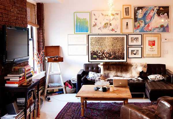 Украшать стены можно не только стандартными предметами. Здесь же можно развесить предметы из коллекции, например, если человек собирает оружие или шляпы. Гостиная в этом случае будет выглядеть экстравагантно.