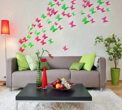 Один из самых популярных мотивов декора – это бабочки. Однако возможно оформление стен и другими аппликациями. Например, удачно смотрятся цветы, звезды и даже просто разноцветные круги. Однако делаются они все по одному принципу, который мы рассмотрим на примере бабочек, а вы с его помощью сделаете то, что больше всего понравится. Для изготовления украшения для стен своими руками понадобятся: