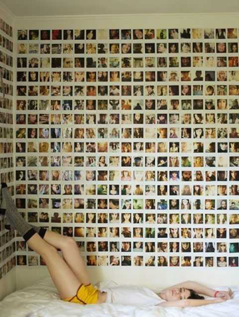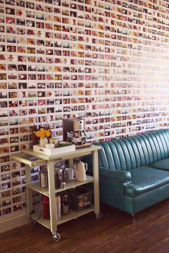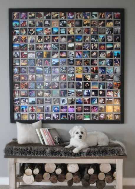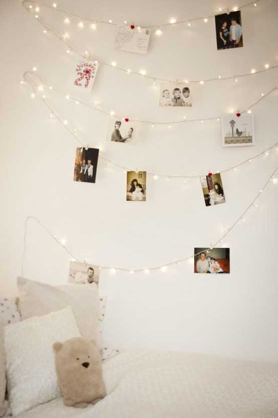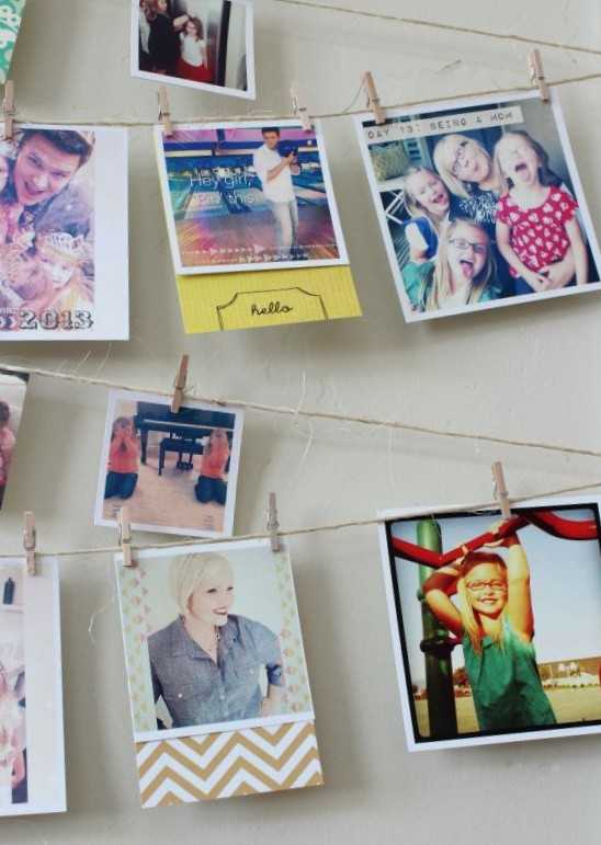 - Оформить стену с помощью пэчворка или множества фотографий, скрепленных верёвкой и подвешенных к потолку.