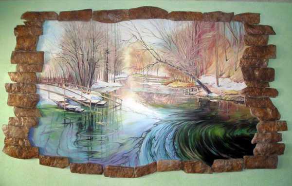 - 3D-изображения – еще одно популярное направление в настенной живописи, однако справиться с подобным оформлением сможет только профессионал высокого уровня.