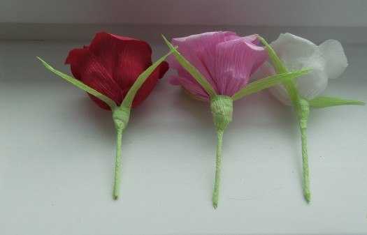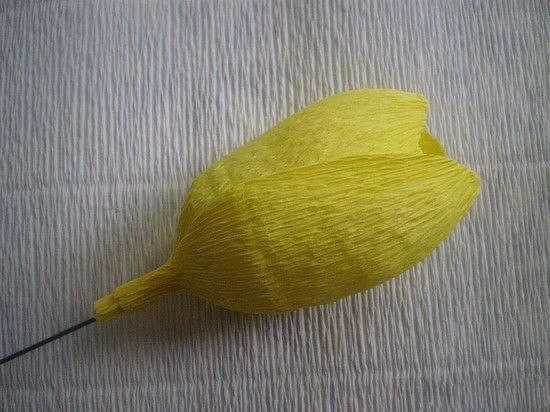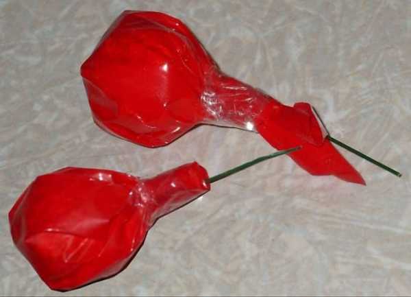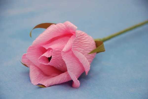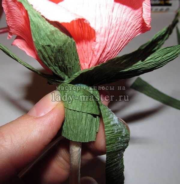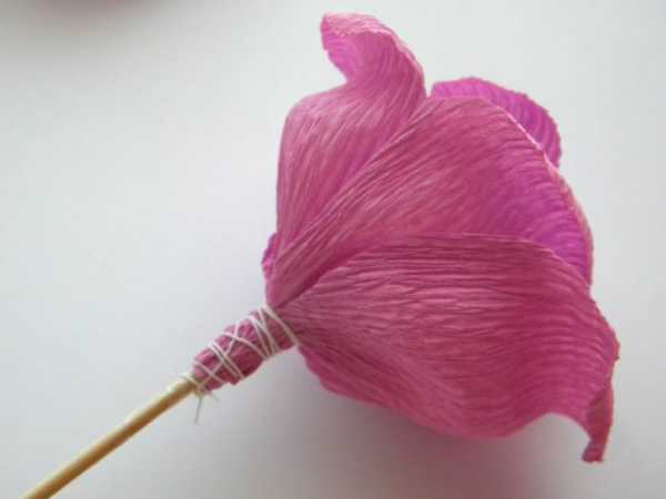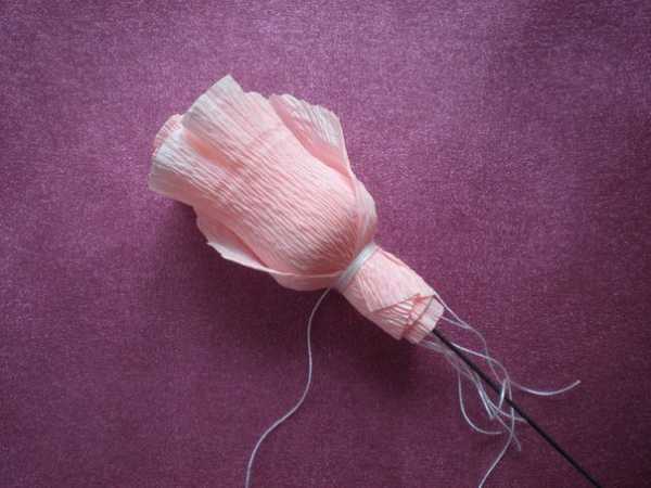 Под бумагу ввести отрезок проволоки нужной длины – не менее 15 см. Основание бутона скрепить клейкой лентой.