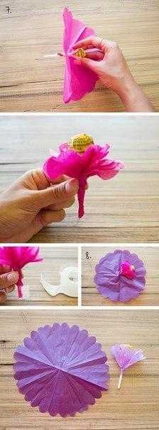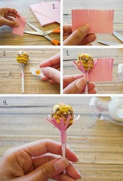 Пальцами формируется форма лепестков, потом лепестки крепятся к палочке с конфетками.