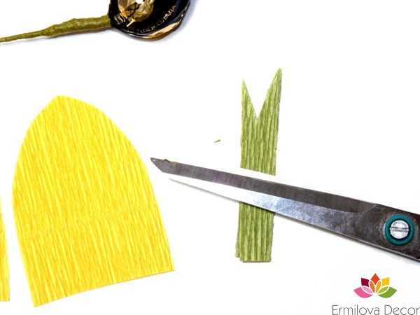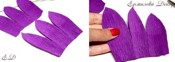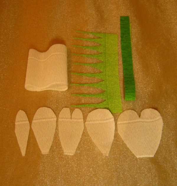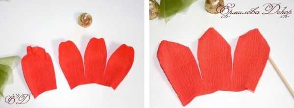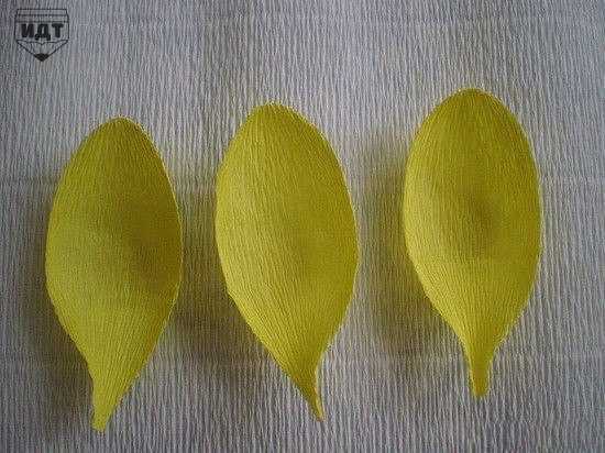 Вырезать из бумаги прямоугольные лепестки, верхние углы подкрутить (можно, наматывая на карандаш). Теперь растянуть середину лепестка – гофрированная бумага хорошо растягивается. Объемные лепестки готовы.