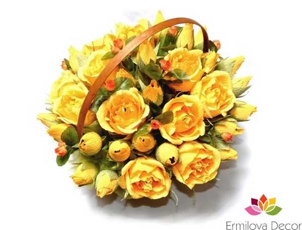 Готовые цветочки вставляются в корзину и добавляется дополнительный декор.