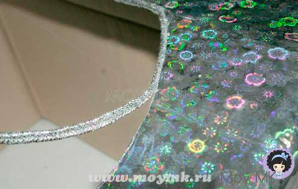 Вырезаем картонный круг диаметром 25 см, с отверстием посередине. Полученную деталь обматываем атласной ленточкой или пестрой тесьмой. Если трубка сделана из обычного серого картона, то ее надо обернуть гофрированной бумагой. Теперь круг из картона приклеивается к пенопластовой головке – он должен сидеть плотно, так как на нем и будет держаться вся конструкция.