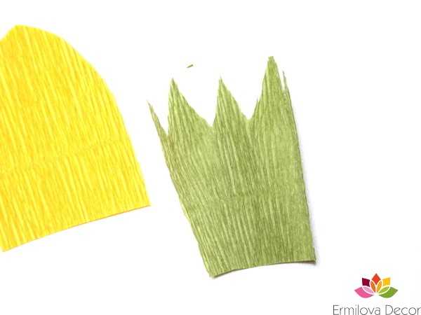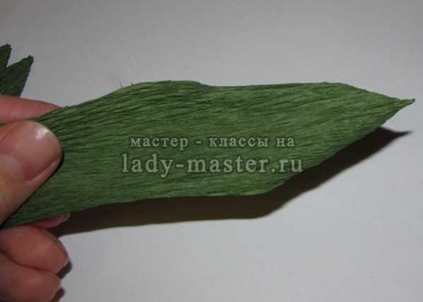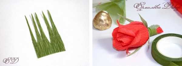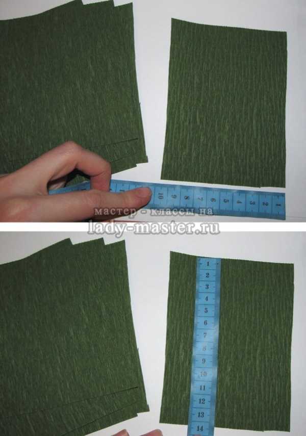 16. Теперь бутон необходимо посадить в чашелистик. Для этого отрежьте от зеленой гофрированной бумаги прямоугольник шириной около 12 см и высотой в 7,5–8 см.