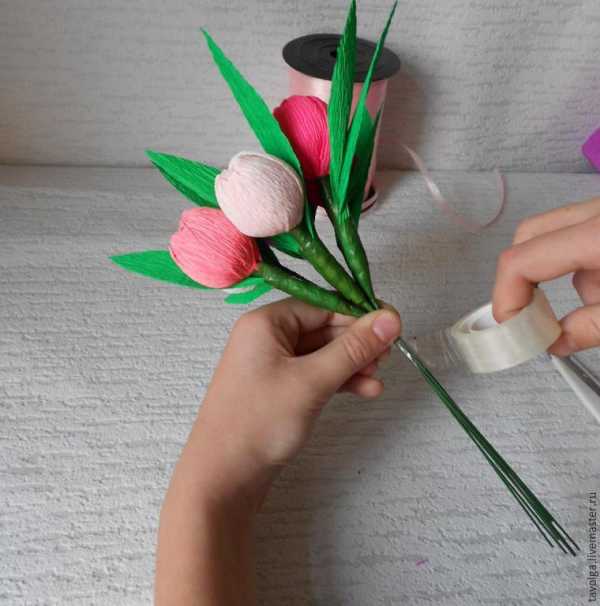 Снизу в бутоны вставить шпажки. Собрать цветки в букет, плотно обмотать все стебли вместе скотчем.