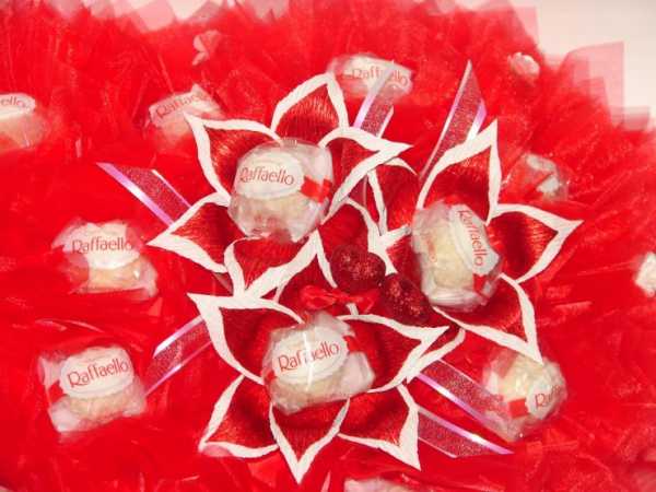 Подойдут любые конфеты круглой формы, даже карамель – в зависимости от предпочтений девушки, но научиться делать букет лучше на «рафаэлках» – они легкие по весу, а значит – цветы будут держаться прямо.