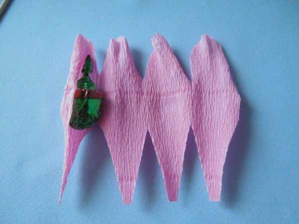 Приклеить лепестки к основанию бутона из ткани. Из зеленой бумаги вырезать узкие листья для того места, где бутон соединяется со стеблем, и приклеить их.