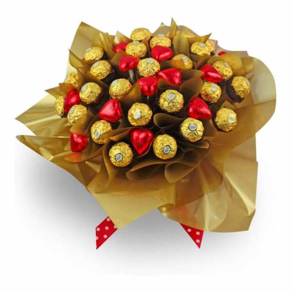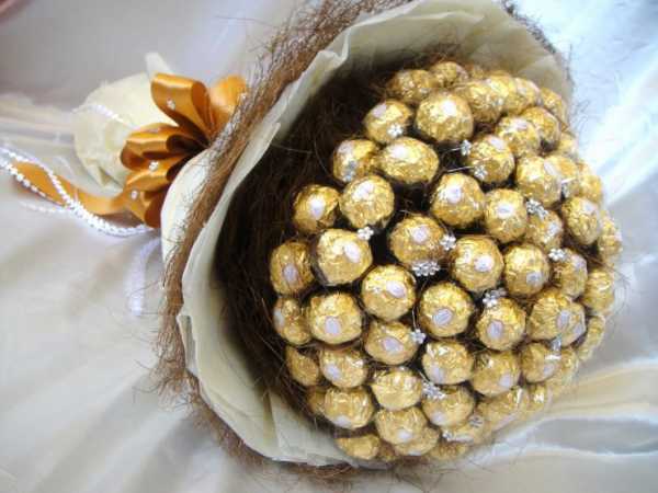 Как нельзя более подходят конфеты Ферреро Роше – они великолепны на вкус и выглядят роскошно и дорого. Можно разбавить композицию Раффаэлло.