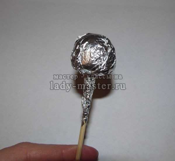 Каждую конфету обернуть большим листом фольги так, чтобы из него скрутить стебелек, а верхушка конфеты оставалась открытой, чтобы ее было видно.