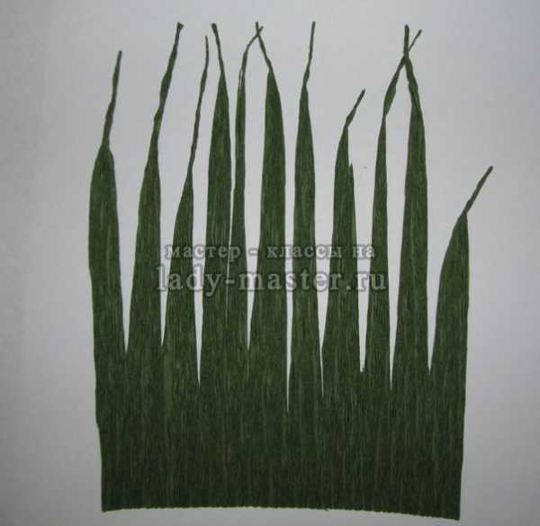 23. Ну что же, цветы готовы. Для букета, который вы видели в начале МК, понадобилось 15 роз. А сейчас давайте подготовим зелень: листочки, перышки и тому подобное. С ними композиция будет выглядеть завершенной. Начнем с травы типа осоки. Вырежьте из зеленой бумаги прямоугольник 10 см х 13 см, нарежьте листочки, закрутите пальцами их края, зафиксируйте ее вокруг шпажки.