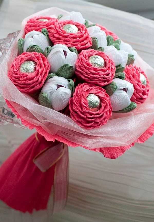 Красивые бутончики цветов, в которые прячутся конфеты, делаются из гофрированной бумаги. Букет из конфет может быть из роз, тюльпанов, гвоздик, хризантем и даже пионов и орхидей.