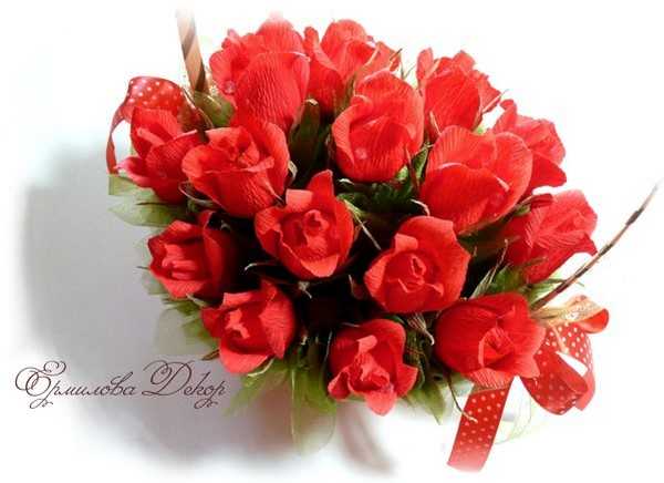 Для корзинки с розами понадобится сделать около 35 штук. Ручку корзинки обвить атласной лентой, отрезок узкой атласной ленточки повязать на ручку длинным изящным бантом. Для благоухания можно нанести на лепестки несколько капелек розового масла.
